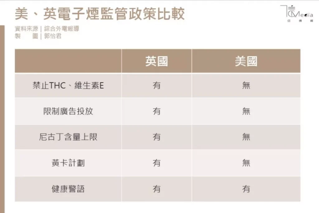 英國與美國電子煙管理方式比較。/圖表來源:信傳媒。